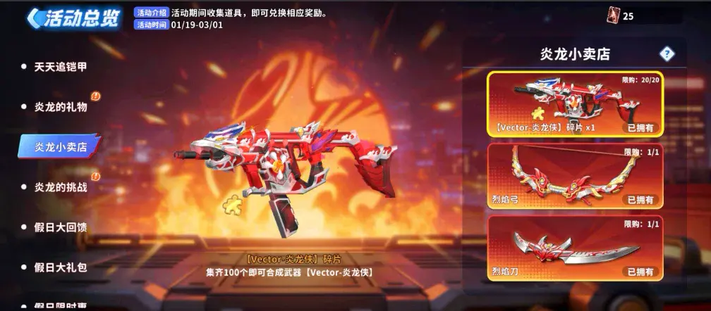 [活动介绍]:1月19日-3月1日,完成日常任务和挑战任务,获取 “武器贴” 道具,可用于抽奖 “Vector-炎龙侠” ,或【炎龙小卖店】兑换 “烈焰刀” 和 “烈焰弓” ;