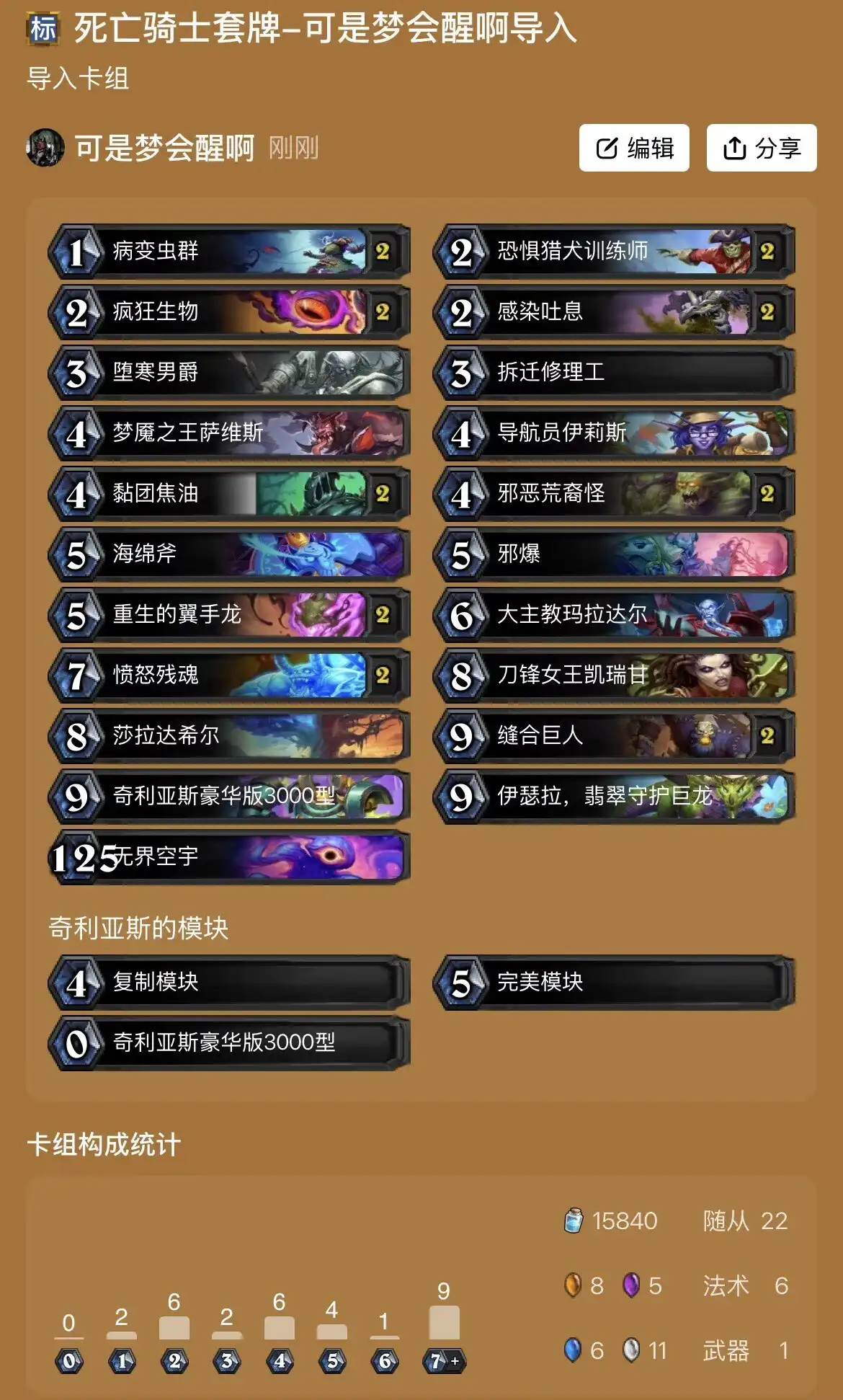 卡组代码:AAECAf7gBgyH9gTHpAaouAbm5QbC6Aaq6gbO8Qap9QaSgwfDgweDigeCmAcJmIEF/7oGtfoGgf0Gl4IHupUHh5wH4bEH4rEHAAED9bMGx6QG97MGx6QG7t4Gx6QGAAA=分析:跟之前的节奏DK基本没什么区别,主要是加上了2张新卡:愤怒残魂和邪恶荒裔怪。前者可以帮助我们快速过牌,后者可以让武器攻击更高。相当于一个大加强。