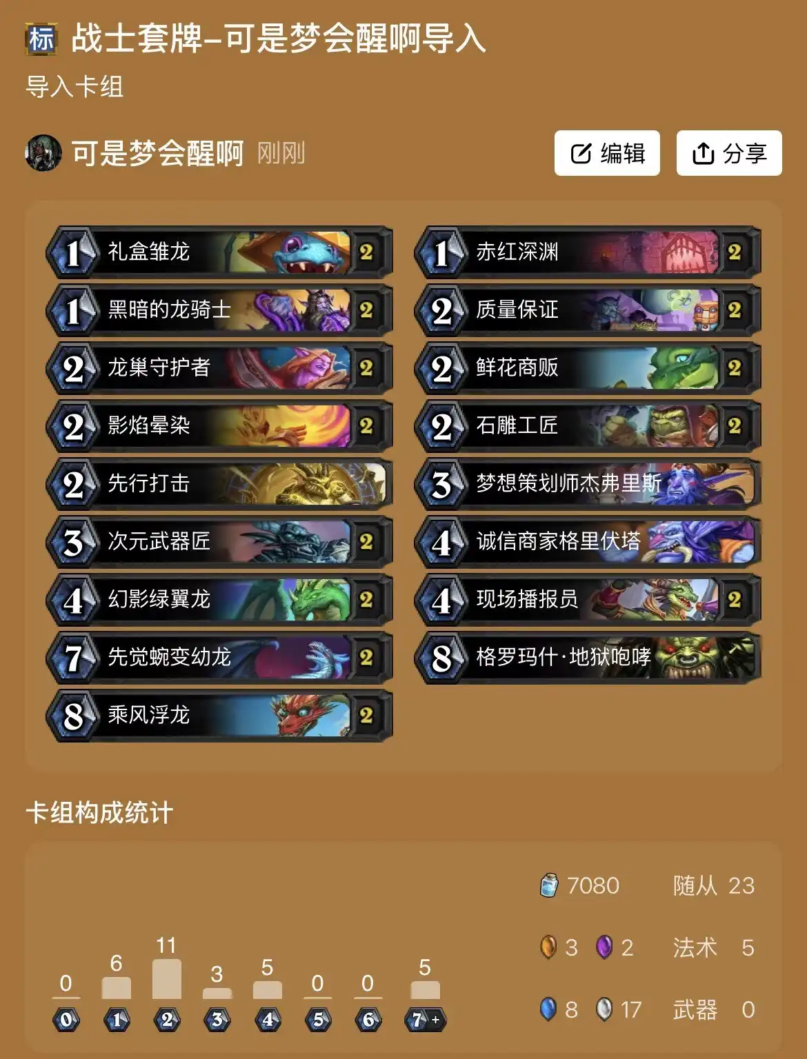 卡组代码:AAECAfm1BwSLoASn0wbM4QaPsQcNkagG6qgG4+YGqvwGq/wGxIEH94MH6IcH0pcHnpkHt60H07IH7LIHAAA=分析:迷你包新增了次元武器匠和先觉蜿变幼龙,这两张卡大大加强了龙战前期的质量