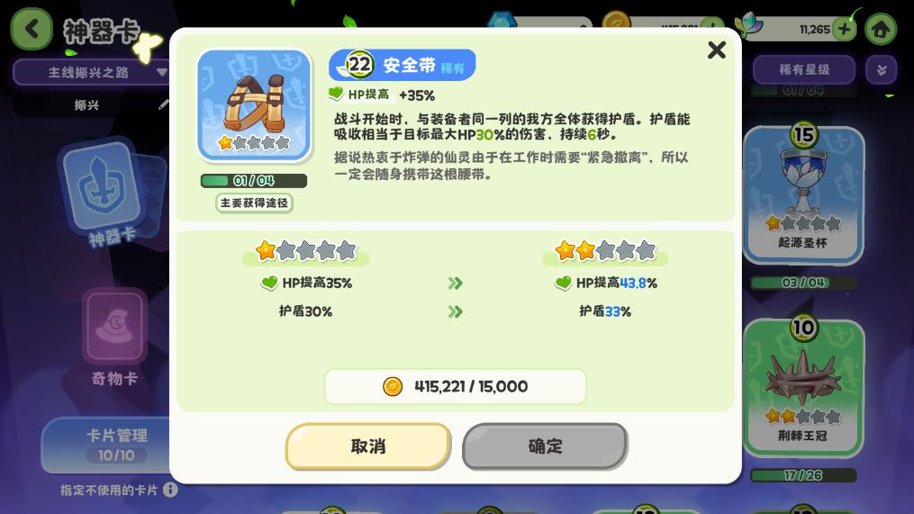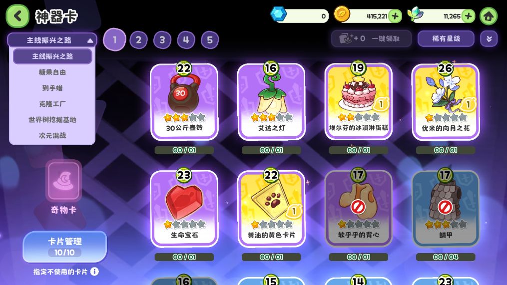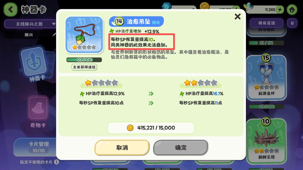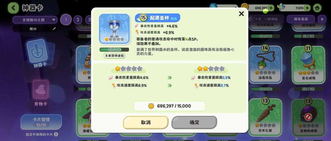 - 配置上限:您最少可携带 20张神器卡 与 15张奇物卡 进入某个模式的备选池。