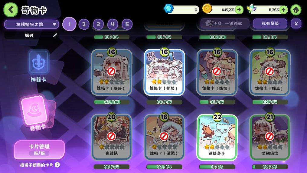 - 主线及其他常规战斗:根据您的主力队伍性格配置。目前开服主流为暗队(忧愁性格),因此,应携带 【忧愁】性格卡,并禁用所有其他种族性格卡(冷静、热情、纯真、活泼),以稳定提升忧愁羁绊等级,获得大量属性加成。