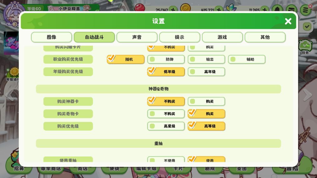 - 使徒设置:不购买闪耀卡片(容易血压升高),职业可随机,优先购买低年级(均衡发展;高年级则优先大招,看命)。
