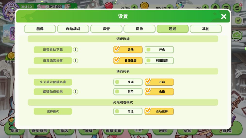- 游戏-设置语音语言:日语配音、韩语配音切换(第一次切韩语配音,需下载语音包,重新进入游戏)