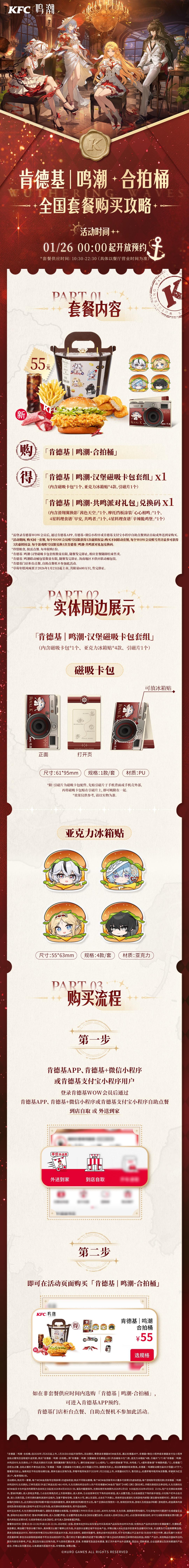 ♦ 购买套餐可得「肯德基 | 鸣潮·舷窗收纳冰箱贴套组*1」(内含收纳冰箱贴1款、圆形透卡4款和镭射票4款)和「肯德基|鸣潮·共鸣派对礼包兑换码*1」
