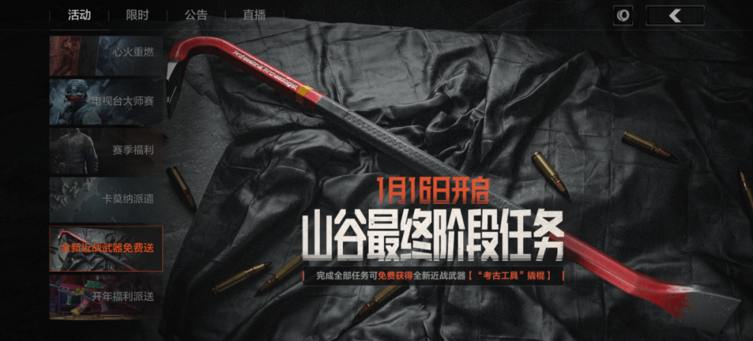 1月16日,山谷最终阶段任务开启,完成全部任务即可获得全新近战武器【“考古工具”撬棍】!