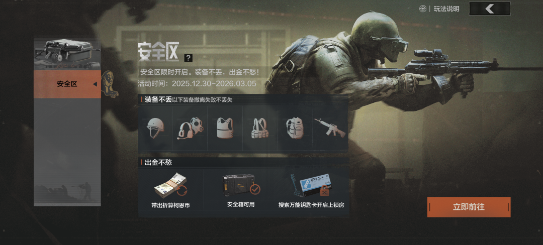 安全区限时开启!进入对局时,装备位上带入的装备和容器中的弹匣将被全部锁定,撤离失败不会丢失!局内获得并带出的物品将在结算时自动转化为柯恩币。