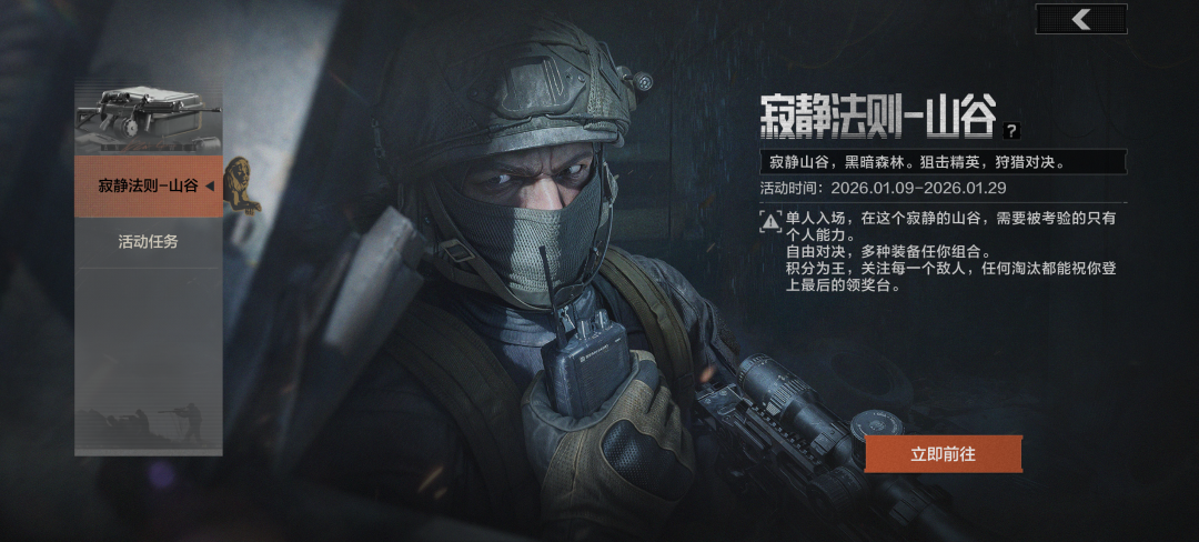 在山谷·新秩序地图中展开狙击对决!对局为单人对抗形式,局内的所有玩家互为敌对关系,击败敌人获取积分,登上最后的领奖台!