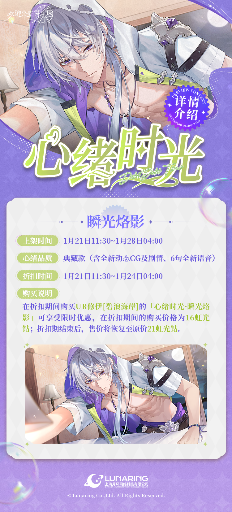 - 售价:在折扣期间购买「心绪时光·瞬光烙影」可享受限时优惠,在折扣期间的购买价格为16虹光钻,折扣期结束后,售价将恢复至原价21虹光钻。