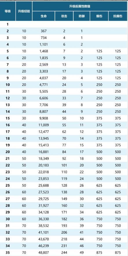 (下图为部分图鉴数据,升级所需经验值以及升级后属性数值)