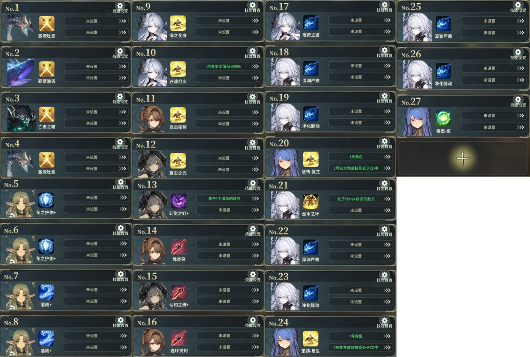 “2号友方增益技能处于CD中”这个目标选择条件存在bug,实际对应1号角色,因此请把艾丽娅放到1号位;但通用中的0,1,2,3号角色是正常对应的,所以奈法3技能的配置为:释放目标“1号角色”+释放条件“2号友方增益技能处于CD中”,从而达成艾丽娅2技能cd时才释放奈法3去刷新艾丽娅cd;