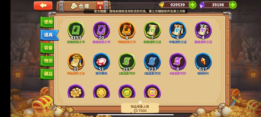 月卡的特证加库存足够今天直接把影魔升阶,紫色我记得也已经够合成一个进阶了,且经验书富足,三级咒印很多