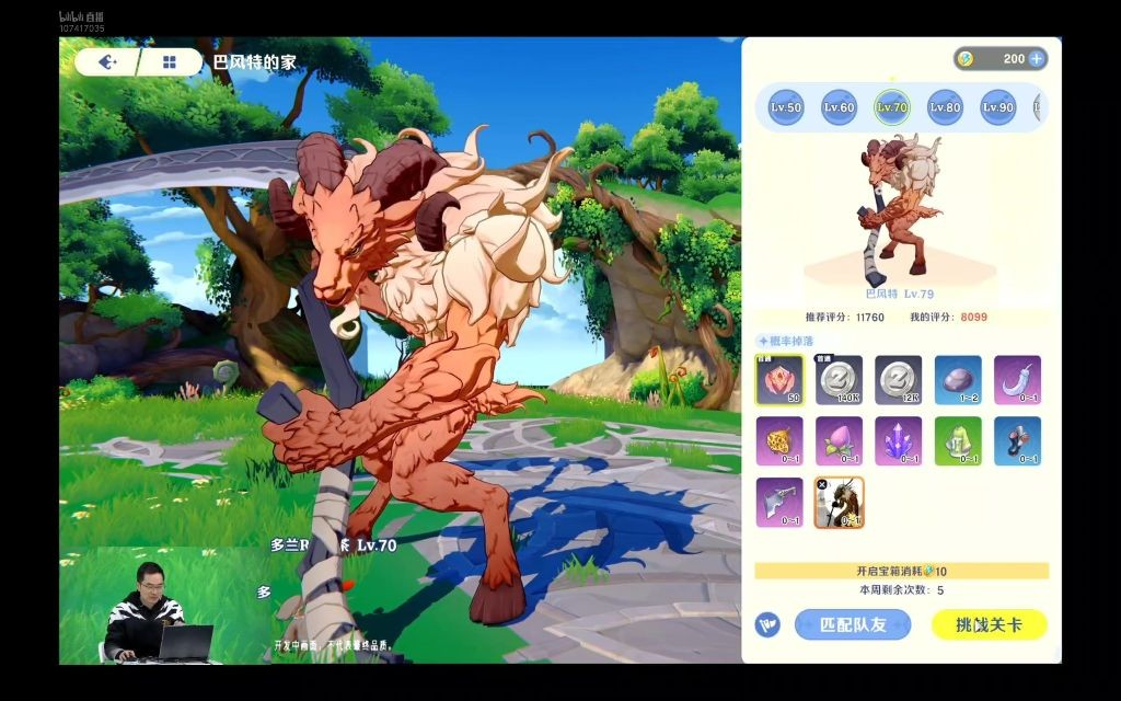副本mvp演示:巴风特按等级分级(Lv.50-Lv.90),Lv.79是当前最强,这个是副本mvp,需要消耗每周次数(这里可以看到演示剩5次),支持组队匹配,演示中挑战失败后1秒复活到副本入口。