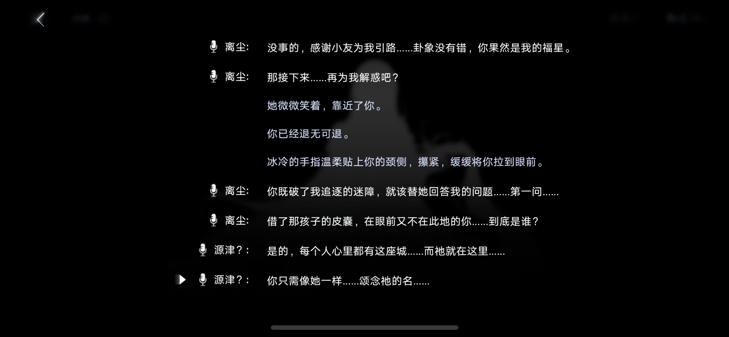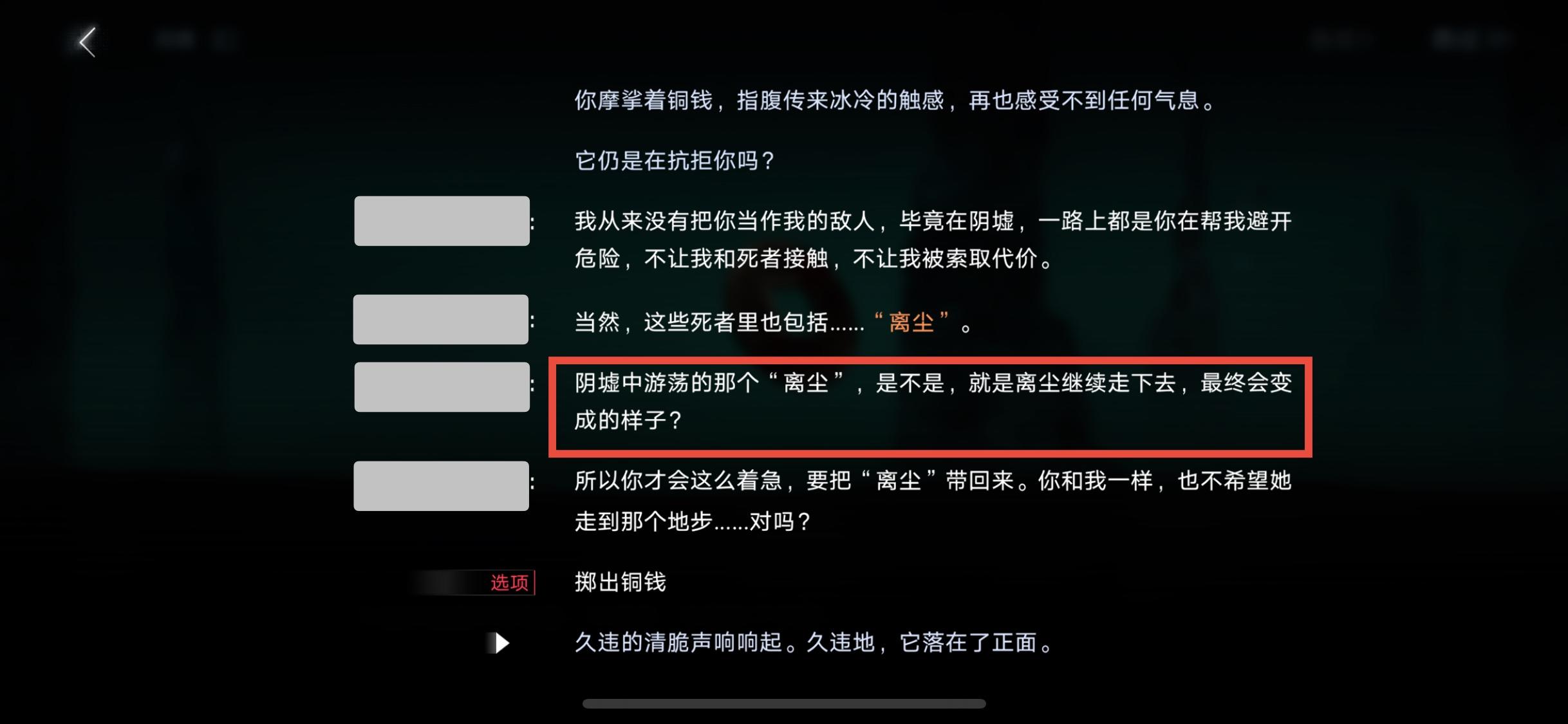 离尘的情况与瓦尼菈类似,让两个离尘相遇会像瓦尼菈那样收束结局。离尘如果没碰到局长应该会在玛利亚城请神上身后被拉入阴墟,在这个节点后如果让两个离尘相遇,就会让因为碰上了局长而还是活人状态的离尘像瓦尼菈一样迅速抵达阴墟“离尘”的状态,目前的情况局长还有改变离尘结局的机会