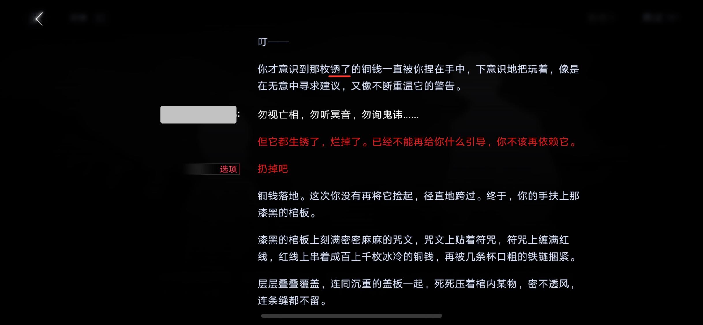 棺鬼铜钱从雾中深处阴墟中走出,所以我认为这枚铜钱也是百年后阴墟“小舅舅”的铜钱(大概率和局长在序章捡到的铜钱是同一枚),回忆里小舅舅的铜钱撒在向导身上碎了,但阴墟铜钱只是锈了