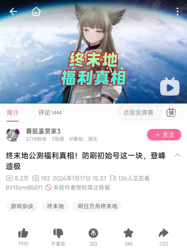 据悉,该UP主疑似在1月17日使用小号发布了针对游戏《明日方舟终末地》公测福利的评论视频。