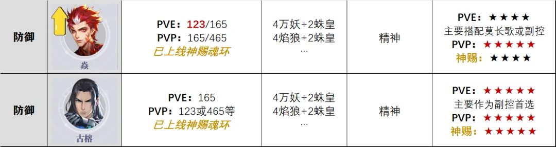 最后则是已经有了两位角色坐镇的防御系,焱嘛......PVE中规中矩,更适合莫长歌队伍和部分双控队伍的副控位,但优先级要远低于古榕等,不过在PVP中焱的这个强度还是相当可观的,不仅可以1奥义来打一拳超人般的巨量伤害,也可以4奥义来限制对方的武魂切换,且外加格挡这个机制有极为适配于PVP战斗的原因,目前焱的这个PVP发挥还是相当不俗的。