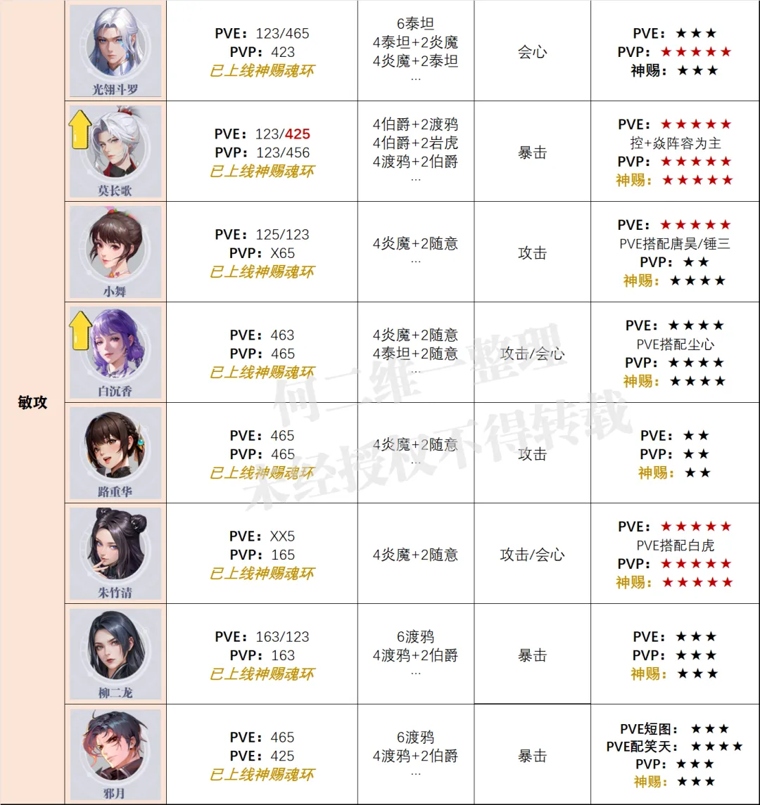 然后在PVP中可以占据第一敏攻之位的光翎斗罗也就没啥好说的了,而猫也是随着老虎的全面发挥可以于PVP于PVE双端占据不低的出场率。