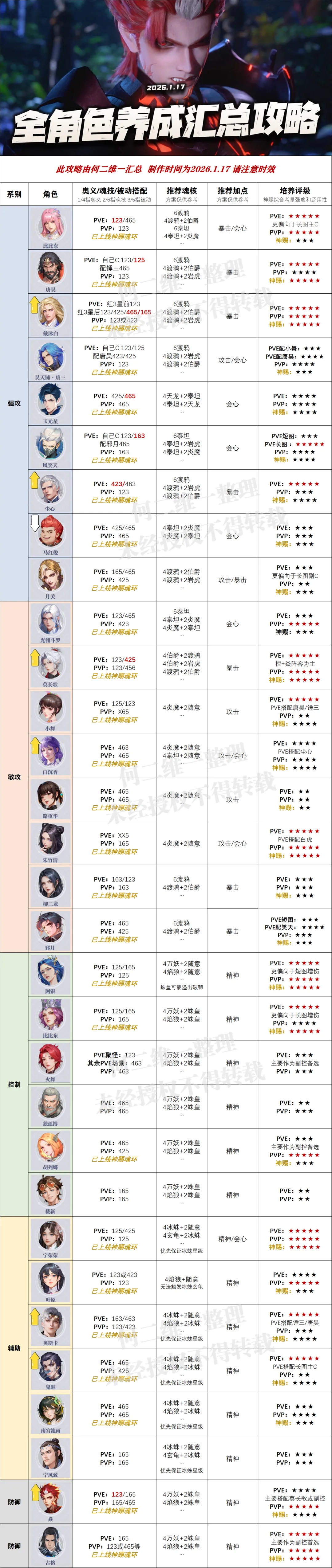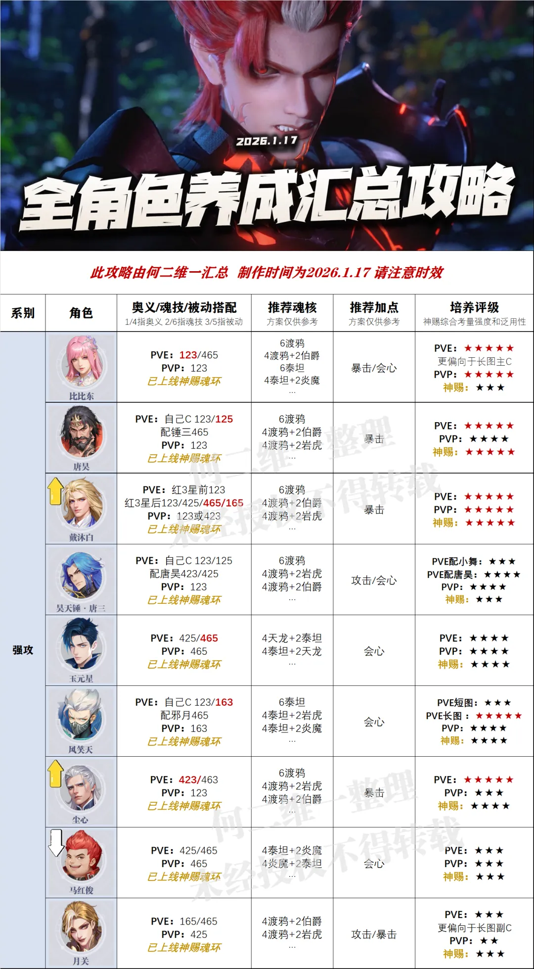 大家好,我是正在内卷的何二维一。今天的攻略咱们来把焱上线后的全武魂强度及培养汇总攻略来给大家做一次更新,而这次的攻略和上次并没有隔太久的最大原因还是由于官方在近期修改调整了很多武魂的强度,例如除了全新限定焱的上线之外,这个尘心、白虎的加强调整也很大程度上影响了当前版本PVE的格局,所以接下来咱们就开始唠一唠当前版本全武魂的具体情况吧!PS:全一图流汇总维一会放到攻略的最后,有需要的朋友可以收藏备用,当然由于汇总的数据过多......如果攻略中有部分出现错误或纰漏之处也欢迎指出,维一会及时进行更新,再次感谢大家的支持。