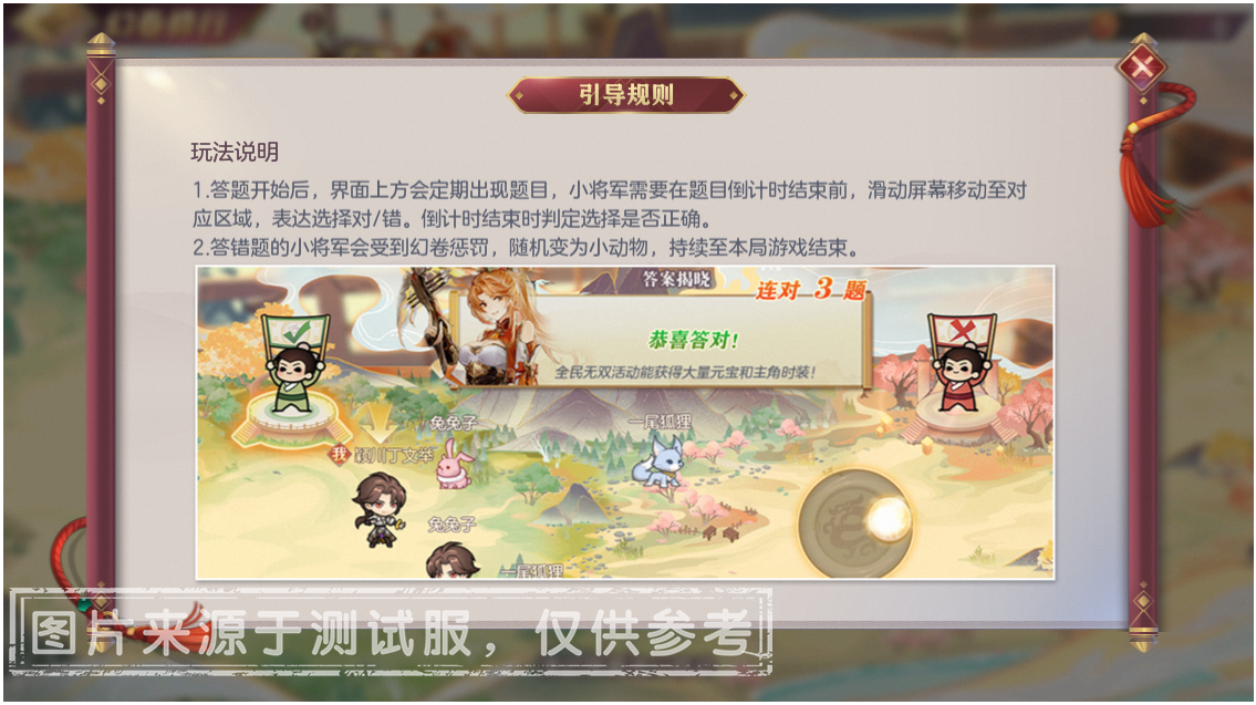 活动期间,小将军进入【幻卷修行】活动页面后,可以点匹配参与阵营答题活动。在活动中,小将军可以根据出现的题目,选择【是/否】阵营。