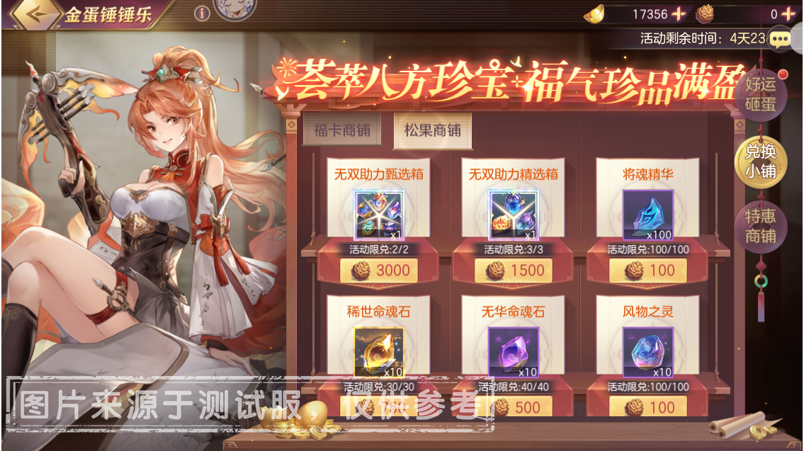 荟萃八方珍宝,福气珍品满盈!小将军可消耗固定数量的「好运福卡」、「好运松果」在兑换小铺中兑换「善灵灵魄十四选一」、「神将碎片任选」、「灵幻命魂石」、「无双助力甄选箱」等珍稀资源!。