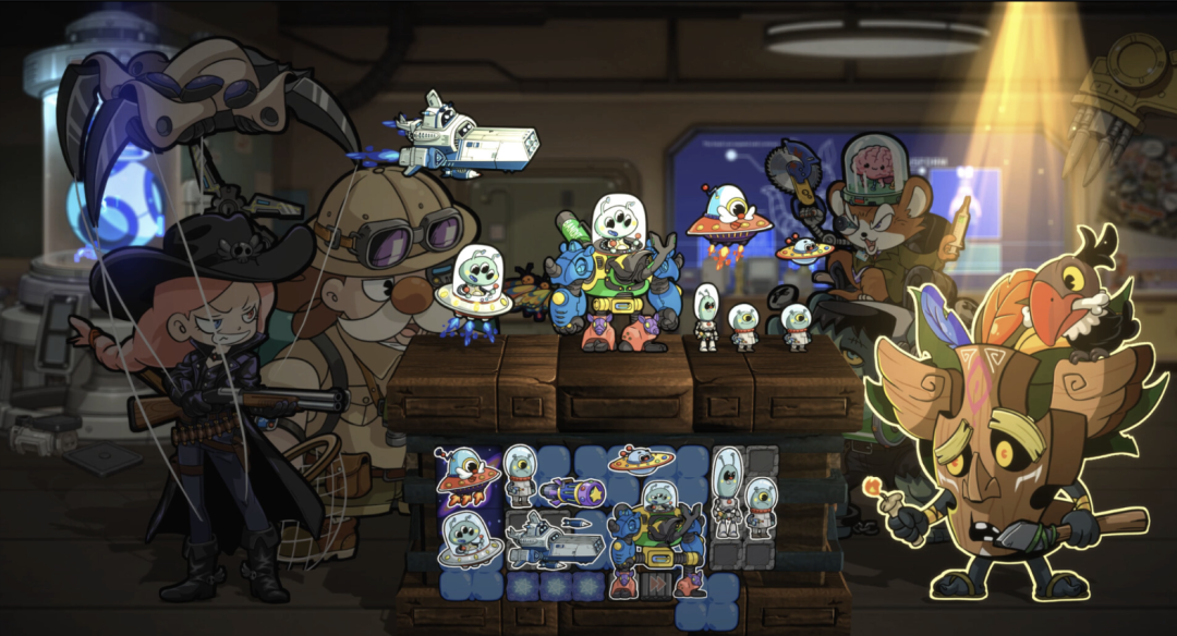 关键灵感,来自于对场景本身的简化。既然美术资源有限,无法制作多变的场景,叙事能力也有限,那何不将突出战斗体验,并且将整个战斗玩法固定在一个场景里?他们最终选定了一张桌子。