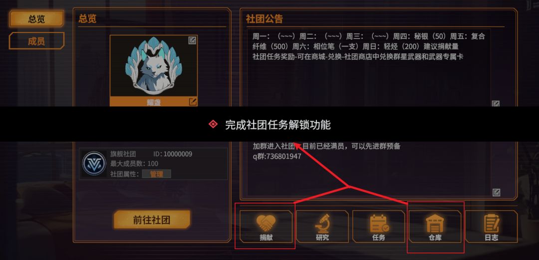 二:社团的"捐献"和"仓库"点击后没有正常的跳转对话框,神奇的变成了"完成社团任务解锁功能",可以看附图;这是在我被任命为副社长后出现的,以前不是。