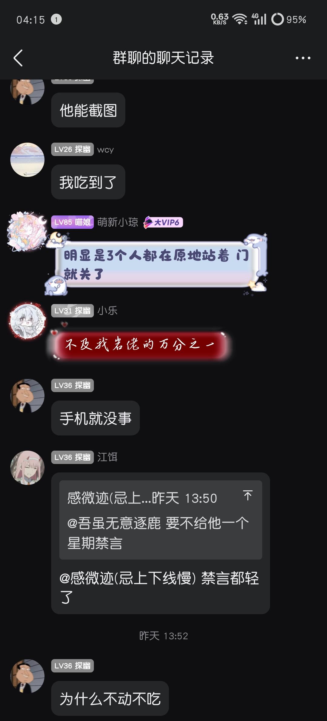 同时群内多人提出被2颗槐树坑过,并质疑其人品,后续有人群友提出槐树此人在主播那坐车经常双开让别人等他,而且有时候两车都炸了,占着车位置奖励也没达到,表现的自私自利,逐鹿要求卡门的人踢出去,结果是禁言7天,看到卡门的人并没有被踢,遂气到退群,群友责质疑群主和稀泥,群主则认为两边都有问题,后被群友认为该退位让贤