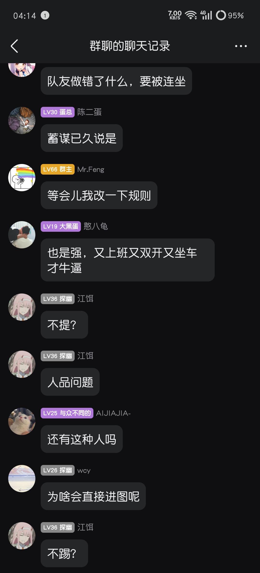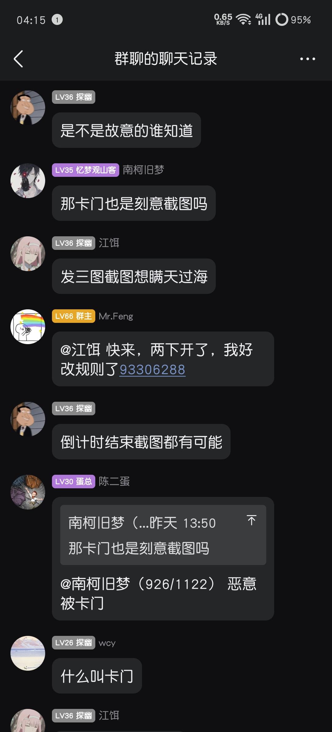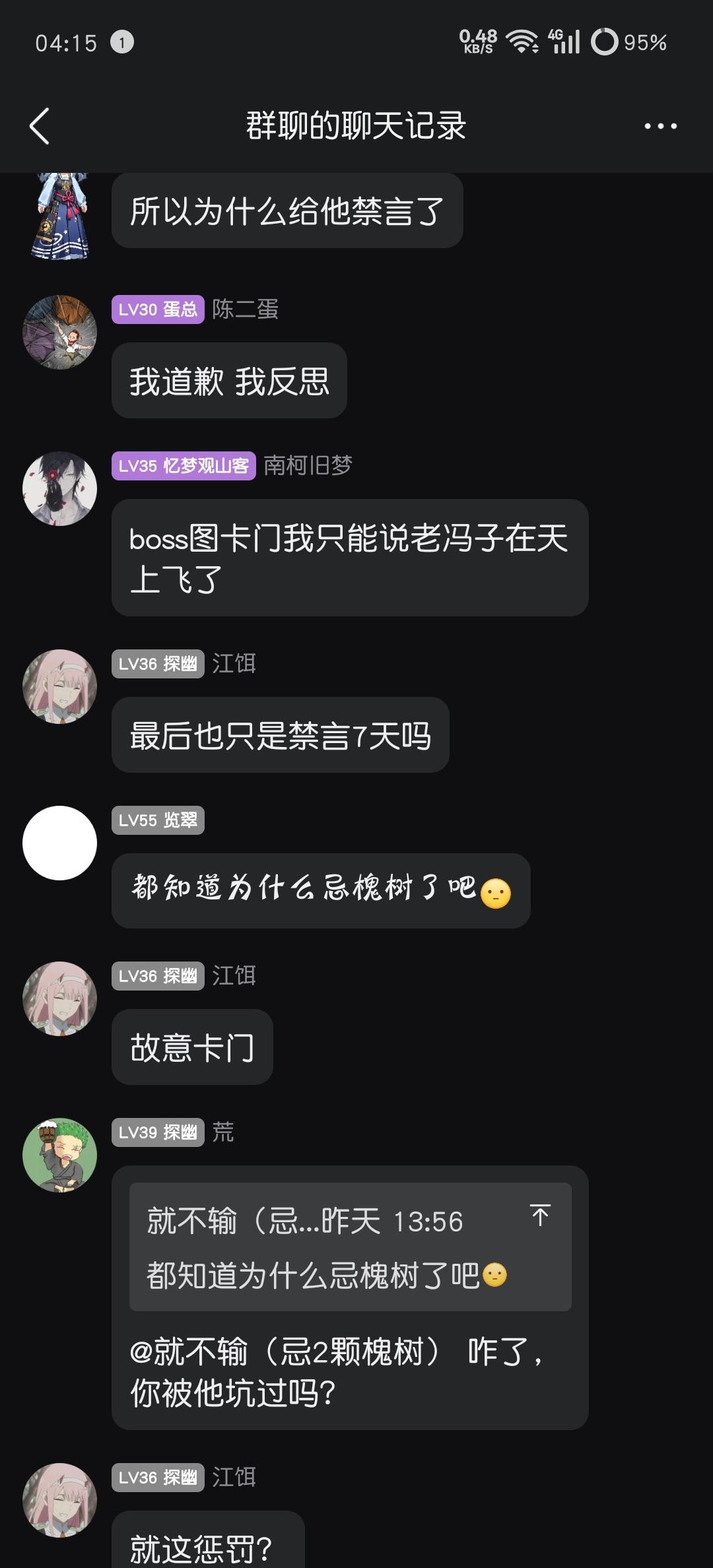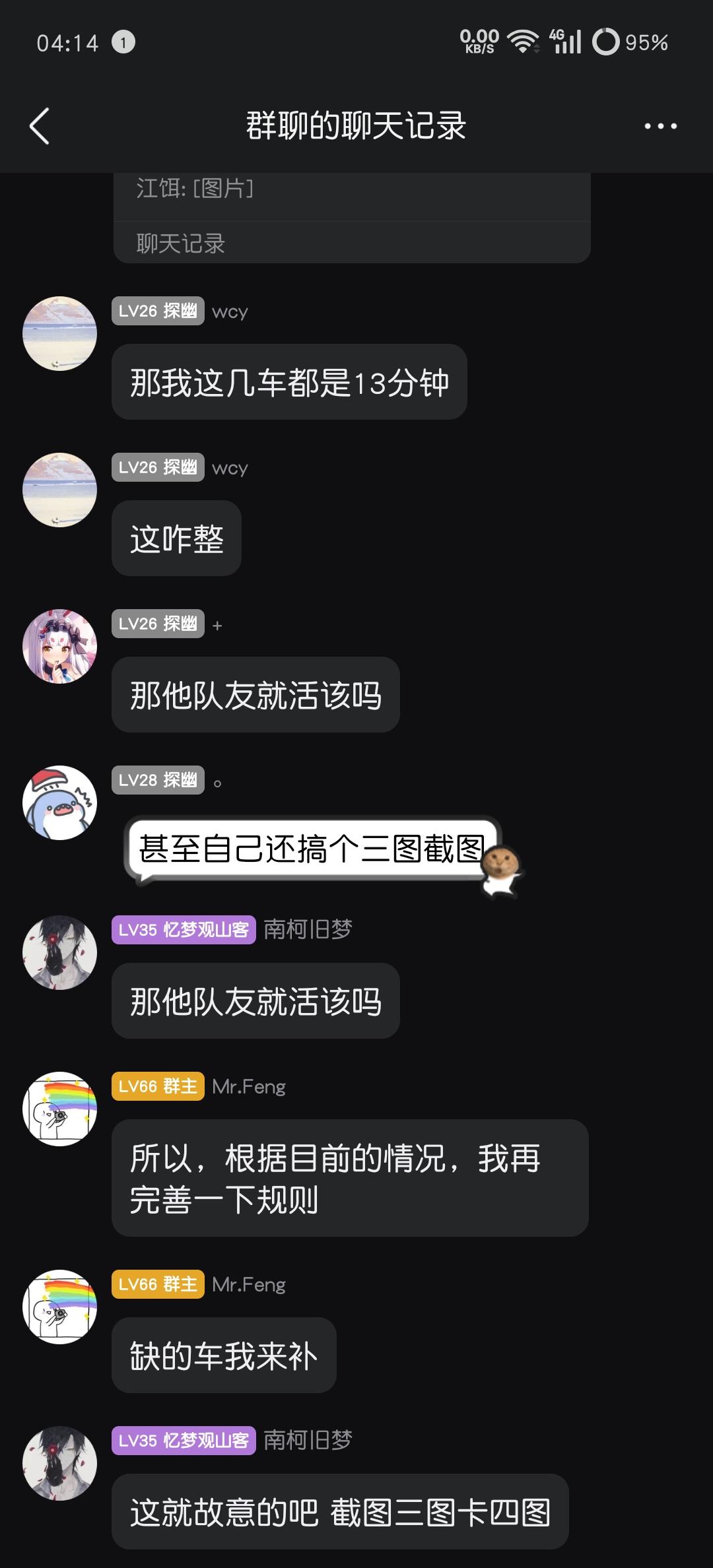起因是(游戏iD门前2颗槐树)轮车中貌似和一位有过恩怨的玩家(游戏iD吾虽无意逐鹿)一起上车,局内起了冲突,最后boss关卡门,导致队友没有吃到奖励,遂回群中质问,并@群主判定责任,