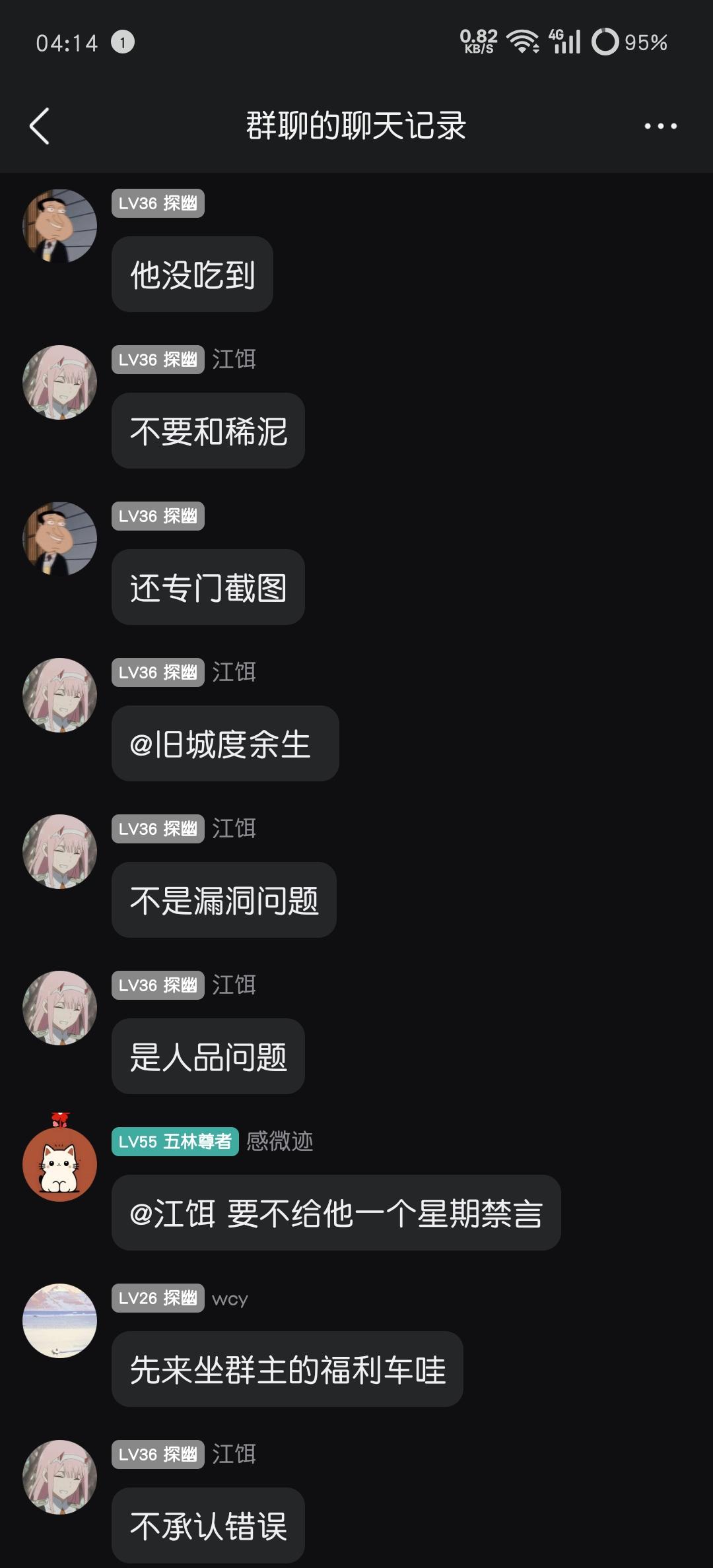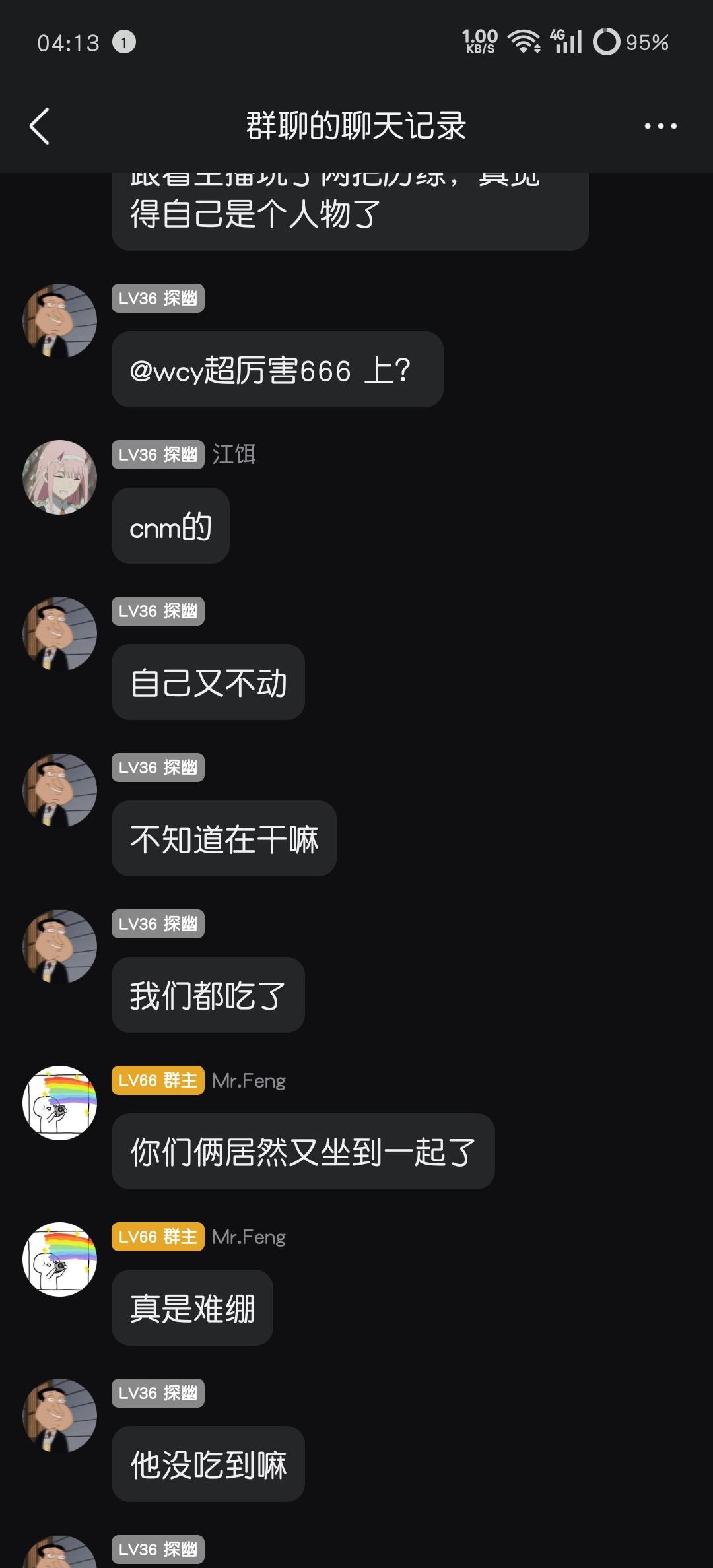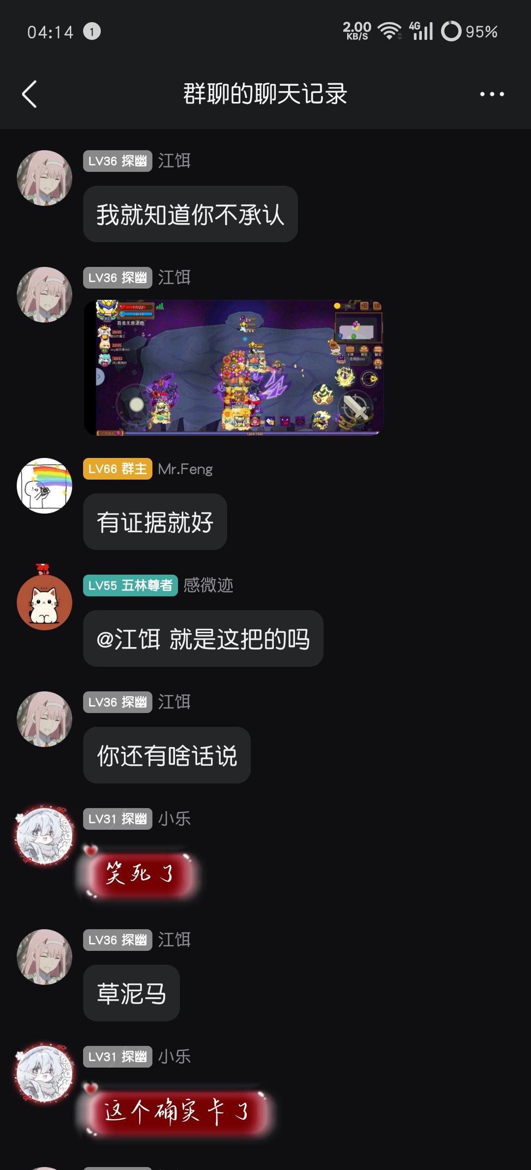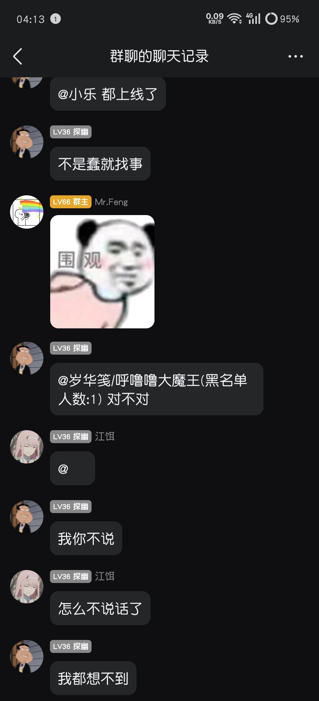 起因是(游戏iD门前2颗槐树)轮车中貌似和一位有过恩怨的玩家(游戏iD吾虽无意逐鹿)一起上车,局内起了冲突,最后boss关卡门,导致队友没有吃到奖励,遂回群中质问,并@群主判定责任,
