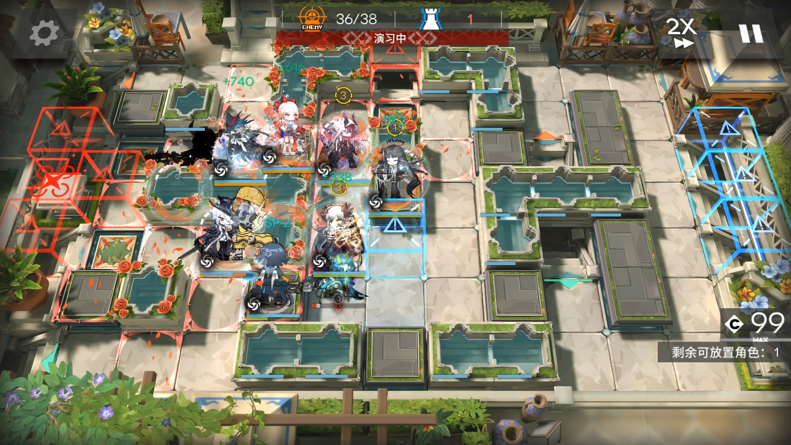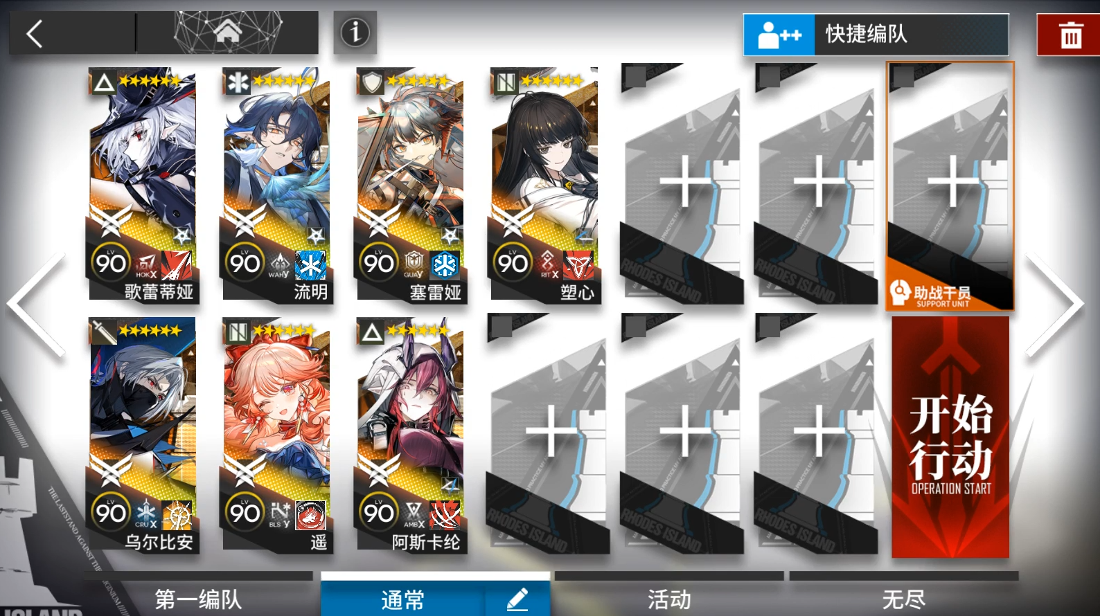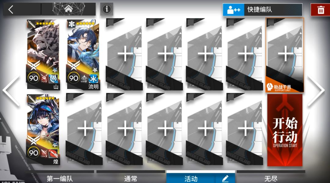 普通关卡有蚀刻章需要奶满水池,所以需要额外带2个医疗。奶右边门口水池。依次部署煌,山朝左,流明朝上挂机。