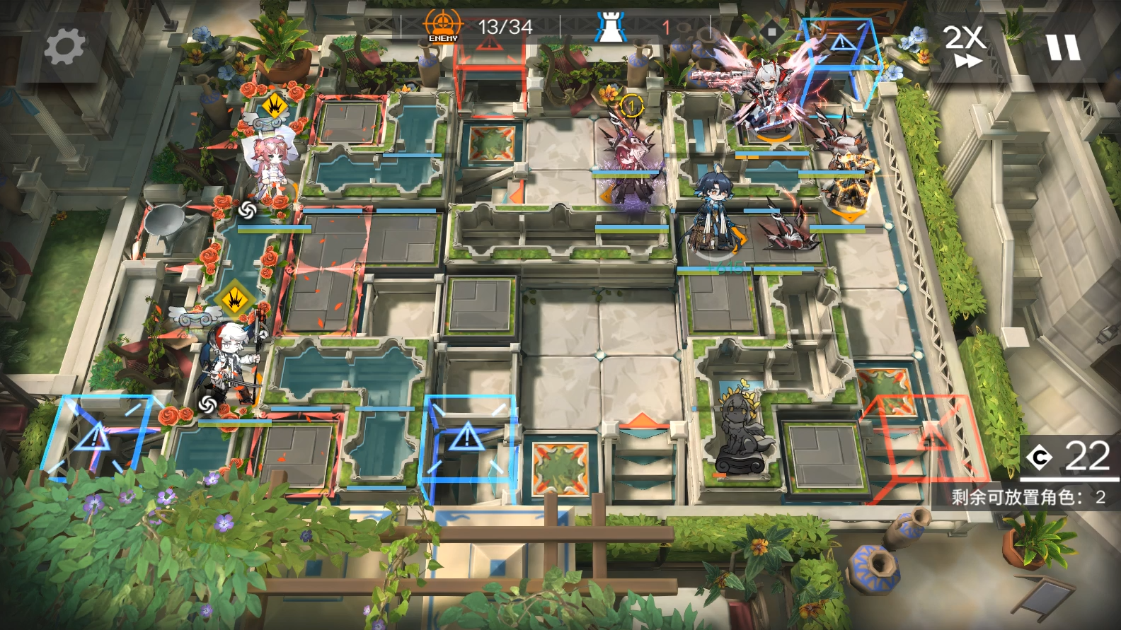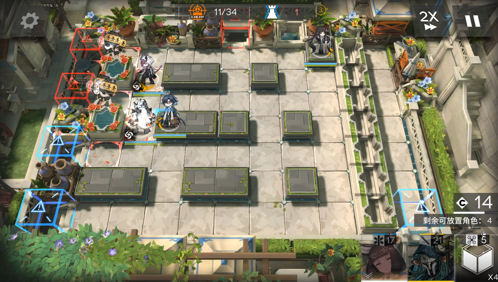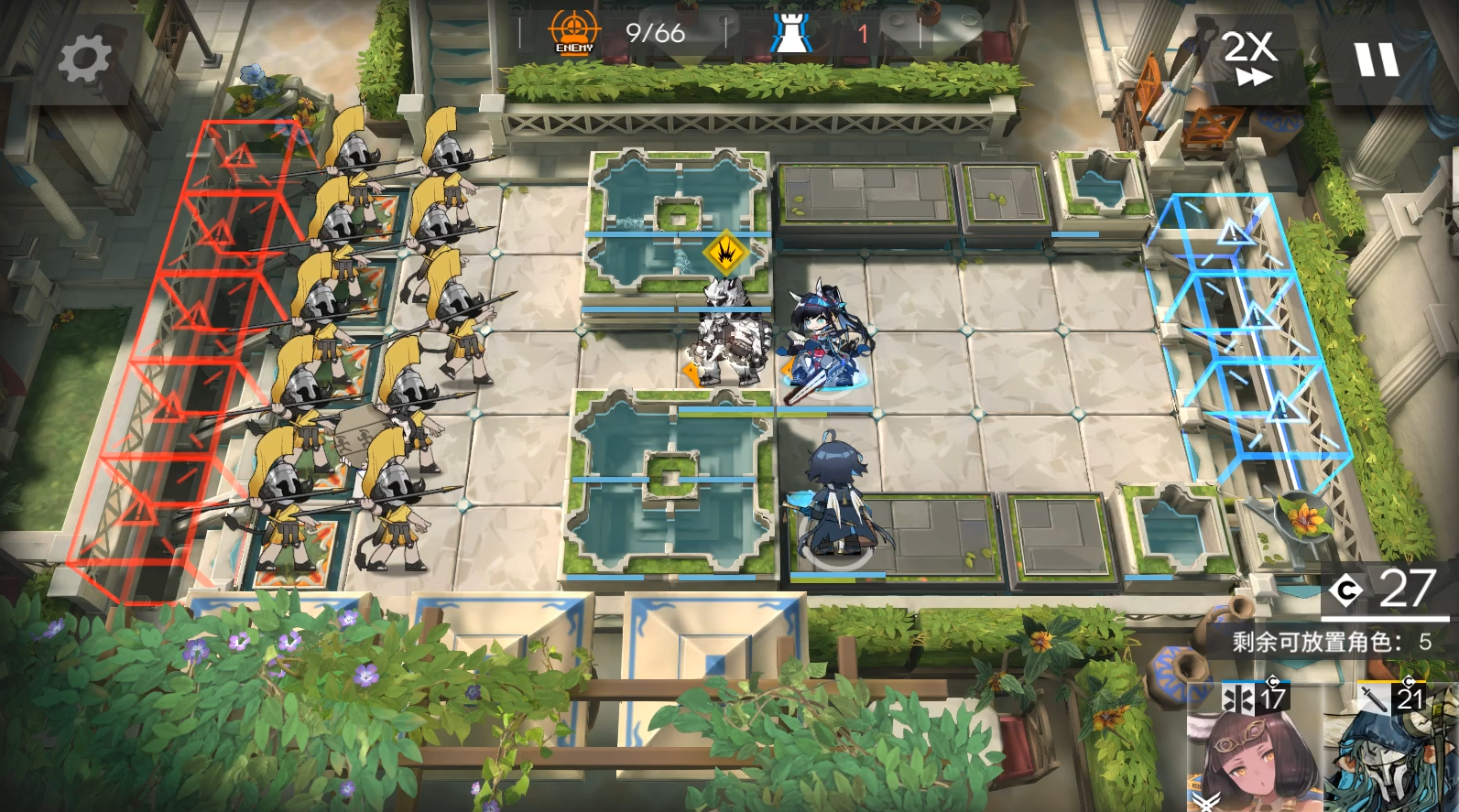 EW开2次技能,开局2先锋在左边水池旁边回费。依次部署EW朝下技能好了就开,塞雷亚。等EW打死雕像后流明朝右,阿斯卡伦朝左。EW等最后还有几个怪的时候再开1次技能,结束。