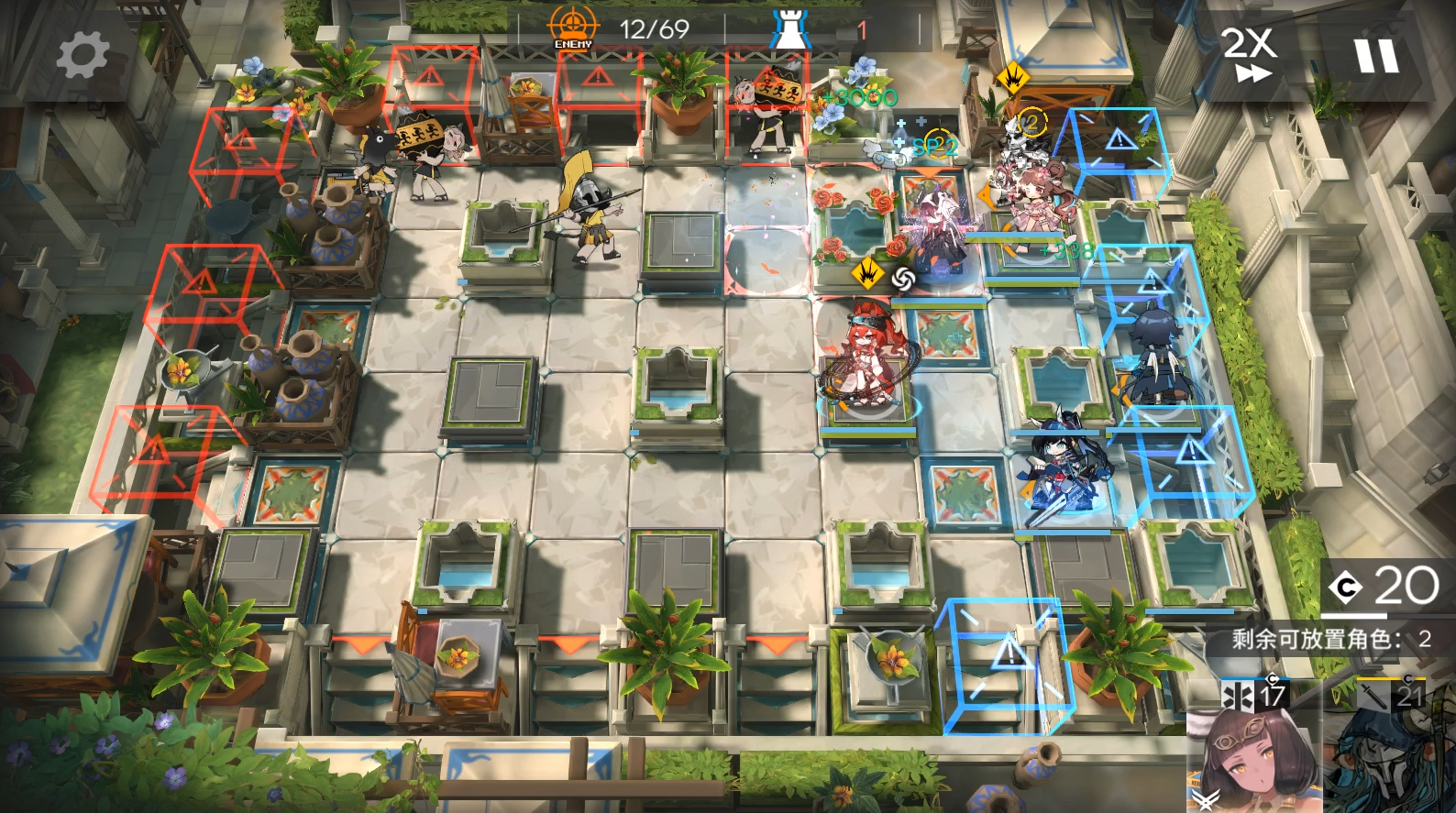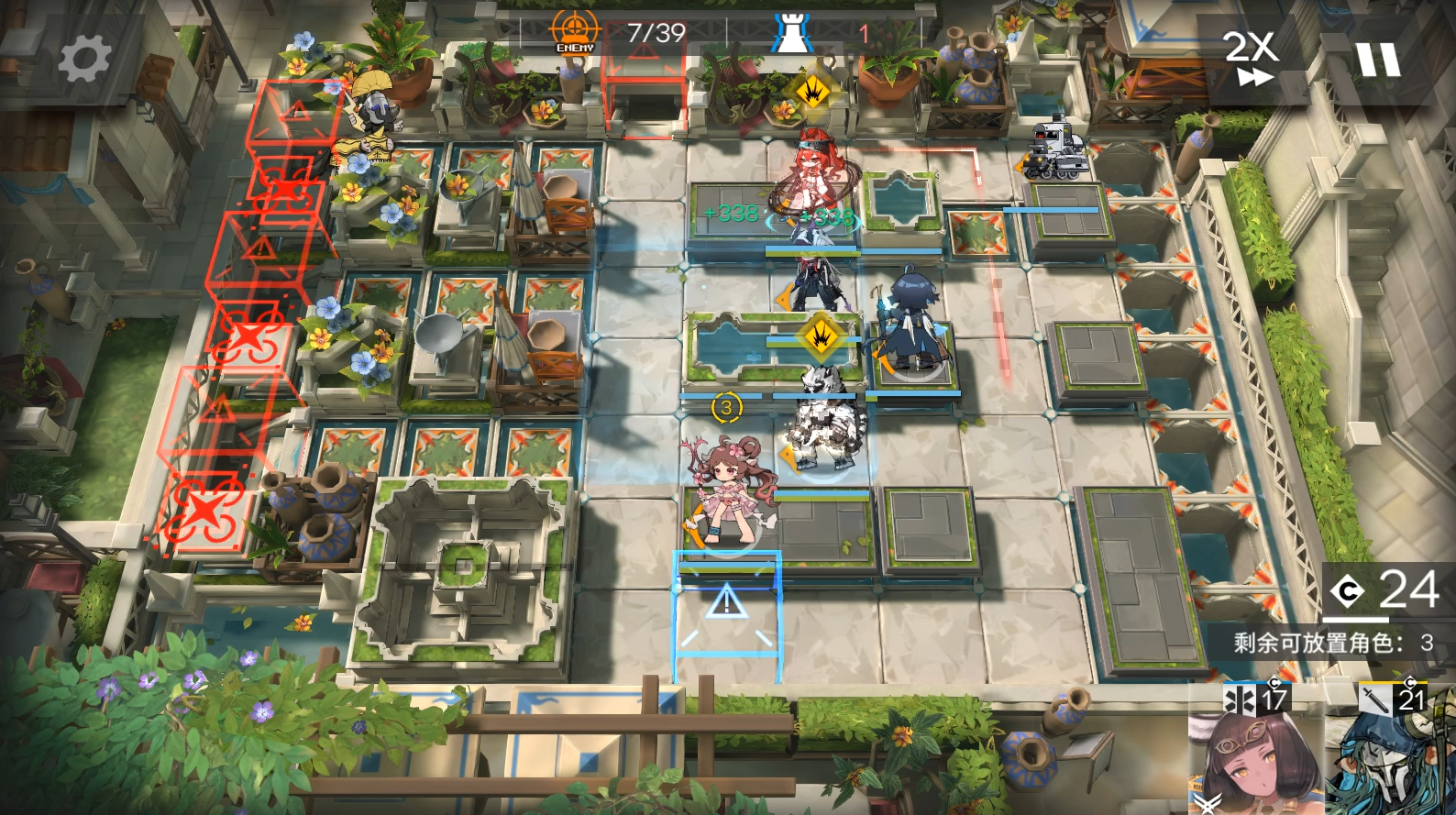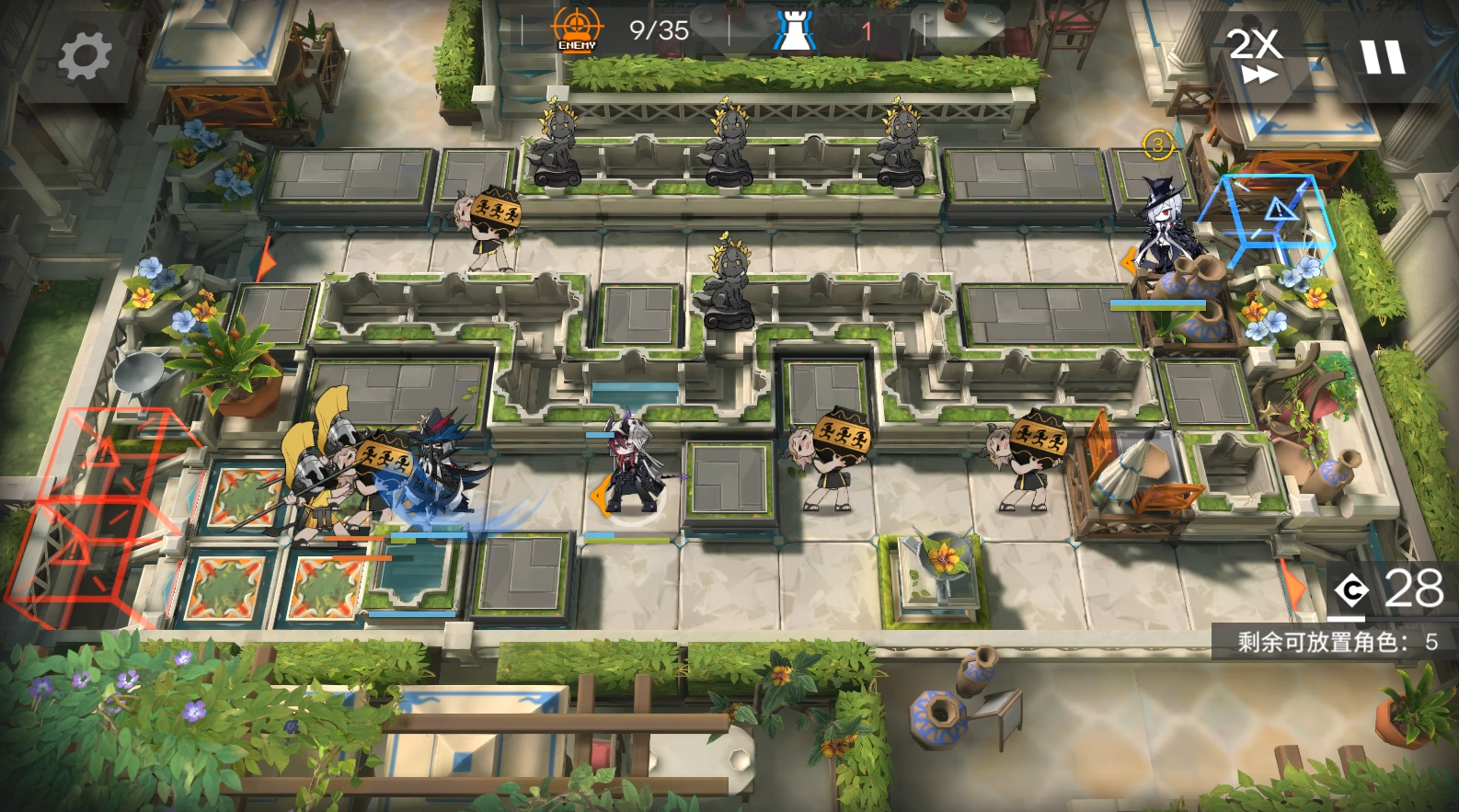 EW开2次技能,开局2先锋在左边水池旁边回费。依次部署EW朝下技能好了就开,塞雷亚。等EW打死雕像后流明朝右,阿斯卡伦朝左。EW等最后还有几个怪的时候再开1次技能,结束。