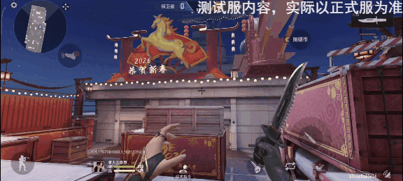 保卫者阵营这边的地图设计也同样优雅,原先十分单调的灰色集装箱变成了印着“2026”马纹的红金箱;两侧高台的护栏上挂起了宫灯,甚至连原本裸露的起重机钢架,都缠上了红色绸带。