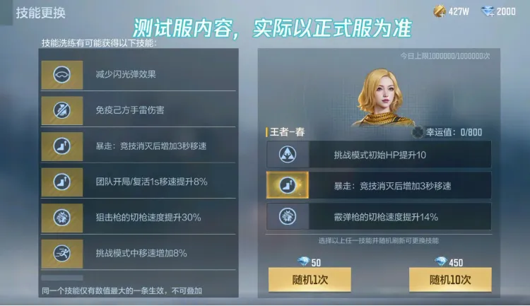 再来给大家介绍一下王者-春可洗炼的技能有哪些,我们可以看到王者-春的稀有技能居然有六个,分别是减少闪光弹效果、免疫己方手雷伤害、暴走:竞技消灭后增加3秒移速、团队开局/复活1s移速提升8%、狙击枪的切枪速度提升30%、挑战模式中移速增加8%,玩家可根据自己的需求来选择三个。