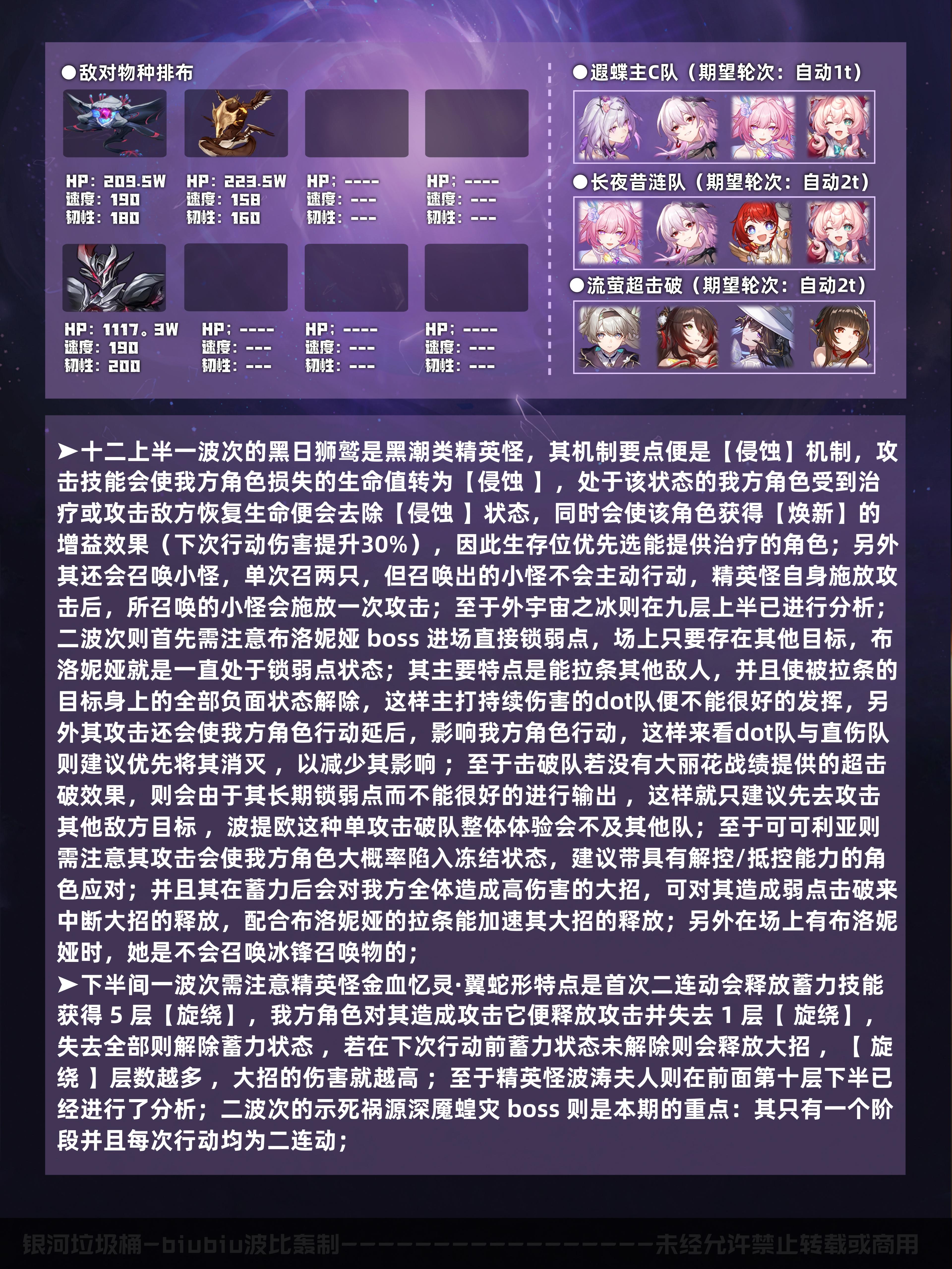 总体来说本期混沌回忆的水温相对温和,十二层敌方的生命值相较于上一期也有所降低,能够达到5t及格线的通关配队也比较多;本期高光队伍是以遐蝶为首的记忆队、白厄队、有了大丽花的流萤超击破,这三种配队在12层上下半均能消耗较少的轮次,另外需要注意本期有不少会锁弱点的敌人,这种环境下如果是没有大丽花的击破队则会受到一定影响(尤其是十二层上半那个锁弱点的布洛妮娅),另外击破队的角色有专属光锥/高星魂才能有不错的体验;