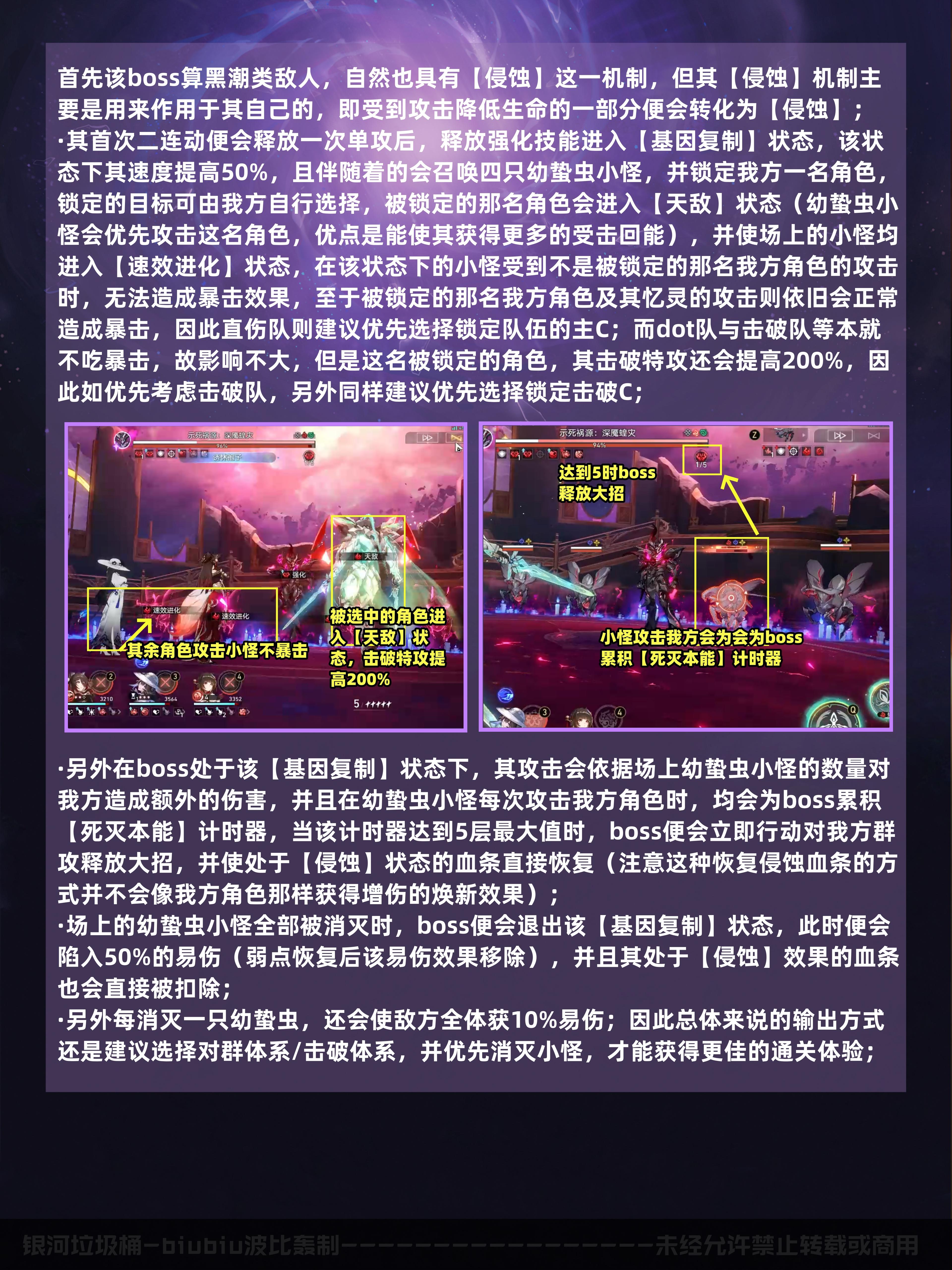 本期混沌回忆综合难度适中,敌对物种上需注意该版本新加入混沌回忆的boss示死祸源:深魇蝗灾;其生命值更是达到了一千多万,需选取群攻角色优先消灭小怪,才能更好的利用其机制,其锁定我方单名角色使其击破特攻提高并让队伍中其他角色对小怪不暴击的机制,更利于单C的直伤队与击破、dot队;至于本期的buff则能补较为可观的伤害(尤其在应对该千万生命的新boss时),但是需要注意其更是要求释放战技或消耗战技点才能获得叠层,这样更适合战技释放频繁的角色(如流萤、白厄、红A等);提供的恢复战技点效果也能很好的利用该buff效果;