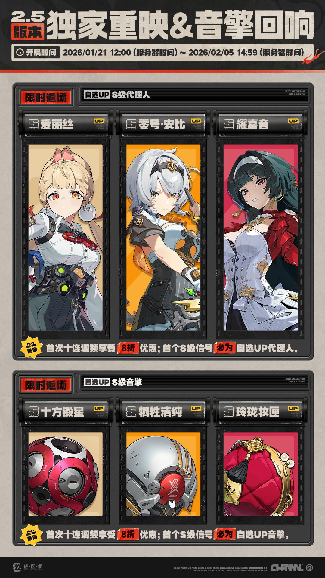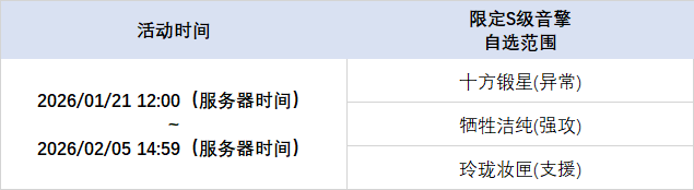 「独家重映」&「音擎回响」自选频段限时开启,调频活动时间为:2026/01/21 12:00 ~ 2026/02/05 14:59,包含如下内容: