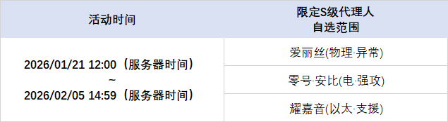 绳匠在独家重映频段获得的首次S级信号,必定为当前选定的限定S级代理人(该保底机制下文简称「福利保底」);在本期频段中,可自选的限定S级代理人包含:[爱丽丝(物理·异常)]、[零号·安比(电·强攻)]、[耀嘉音(以太·支援)];绳匠可随时在调频页面切换页签更换UP的代理人。