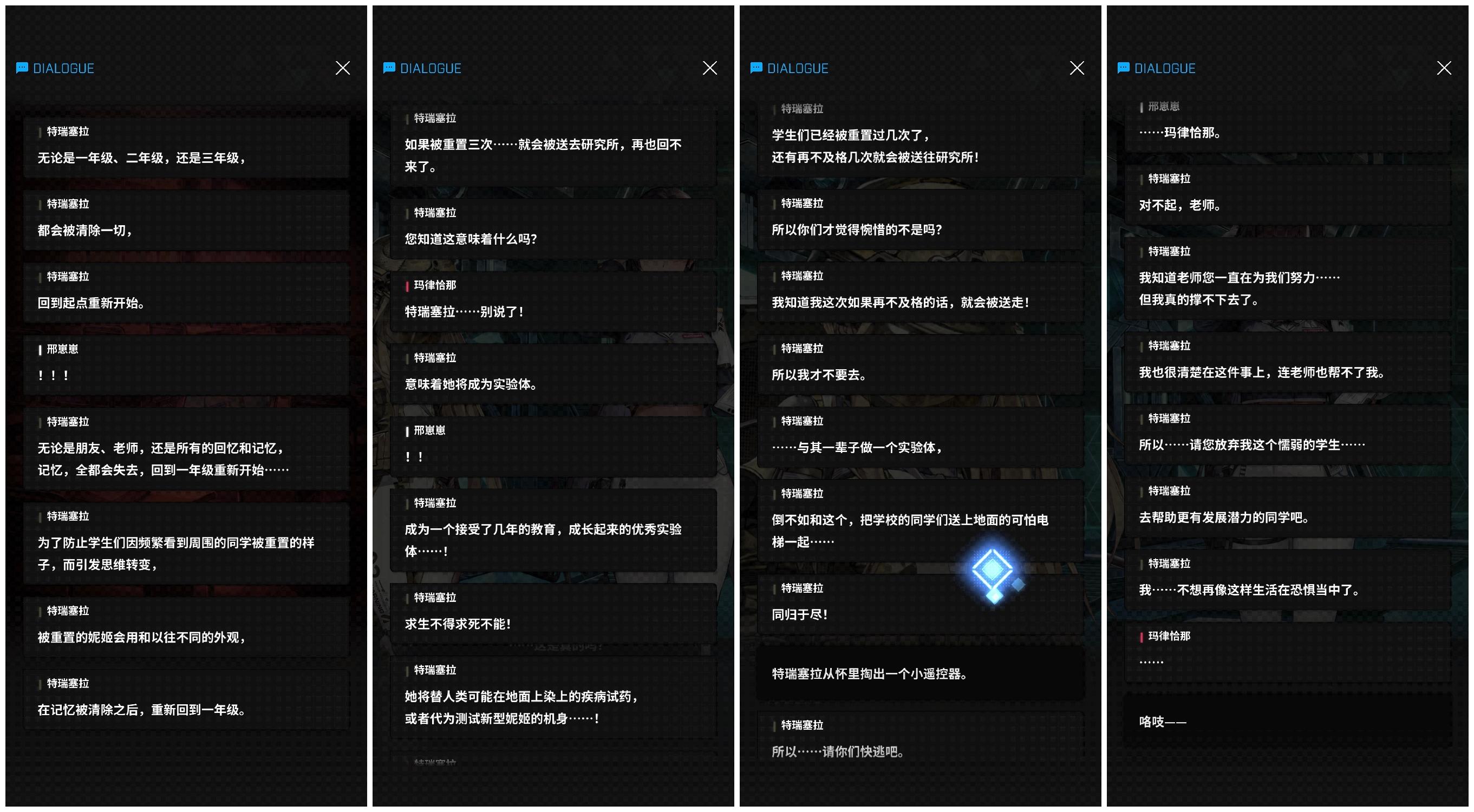 其中一位学生感觉自己重置的次数已经很多,因为恐惧最后被舍弃的命运于是在考试之前试图做恐怖分子给学校和通往地面的电梯炸了