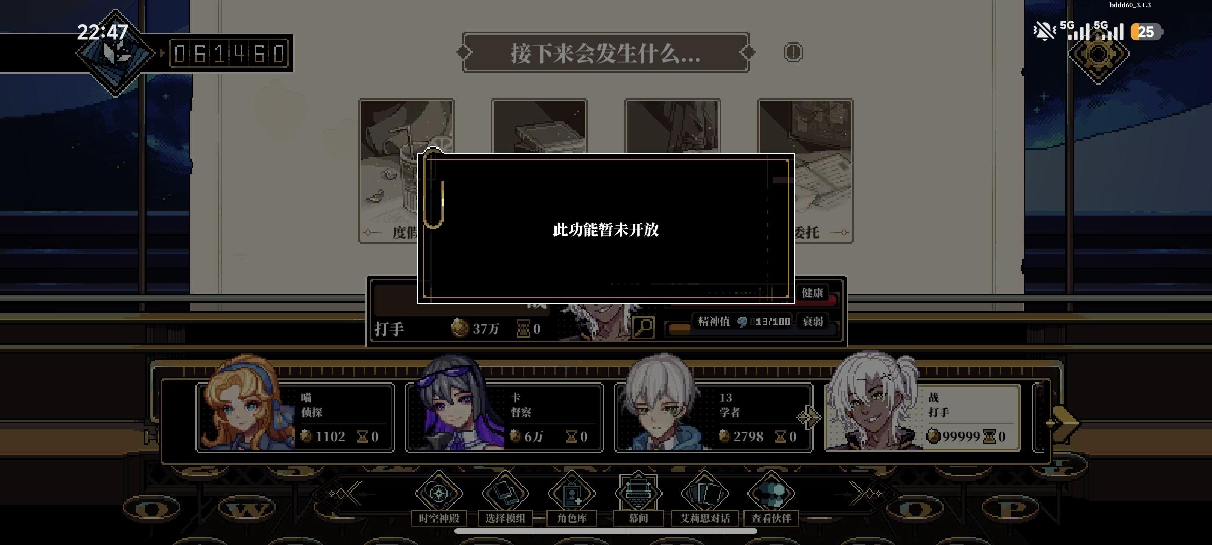 然后幕间是在这里,然后每次通关模组后获得12格时间,右上角时空点数正在优化中,暂时没用,之前是在转折里面用的