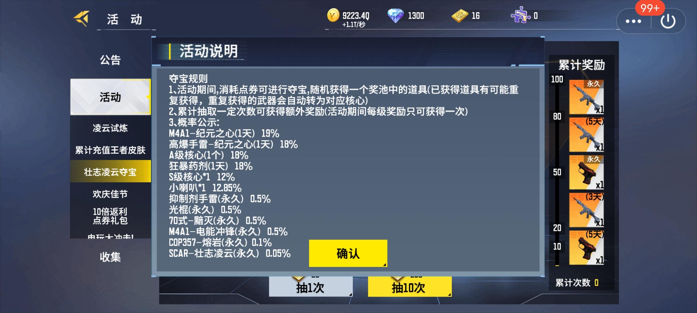 夺宝小建议:如果点劵足够保底的小伙伴建议直接开抽,抽满100发再优先领取50/100档位奖励,再接着领取10/20/80档位奖励,这样能白嫖许多a级核心。