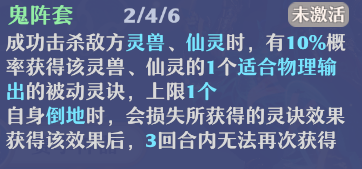 力合欢常规选择6神隐套或者6隐怒套,激进的可以选择4神隐套2鬼阵套,只要凑齐两件即可激活,神隐套回合结束存活概率获得隐身且回合初能恢复最大气血10%的血量,隐怒套施放所需怒气小于60的特技后,返还5点怒气,鬼阵套击杀灵兽或仙灵后概率获得对方1个适合物理输出的被动灵诀