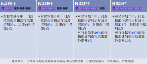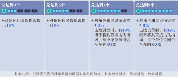 气海搭配太冲、通天、商阳、晴明。太冲:对灵兽/仙灵/怪物的伤害增加10%;通天:提升5%的伤害结果,10回合后再次获得一层效果;商阳:封印未命中时恢复50%法力值,叠加1层元气,3层后转化封印必中;晴明:被封印时降低5%受到伤害,叠加1层元气,3层后转化封印抵抗