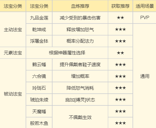 被动法宝优先选择鹤云幡,其次再补上天魔幡和琥珀朱绫,鹤云幡能提高自身的速度,升级满后可以选择天魔幡和琥珀朱绫,增加自身的物攻伤害和增加幻形卡第一张的属性,防御法宝推荐六合镜,血炼降低受到的物伤