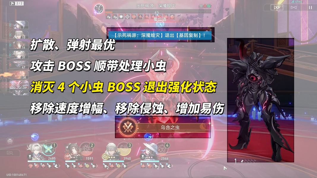 第2波,示死祸源:深魇蝗灾,对局中它会将部分所受伤害转为侵蚀,存在特殊技能将侵蚀重新转变为生命,尽量契合属性弱点击破让它少行动最优。