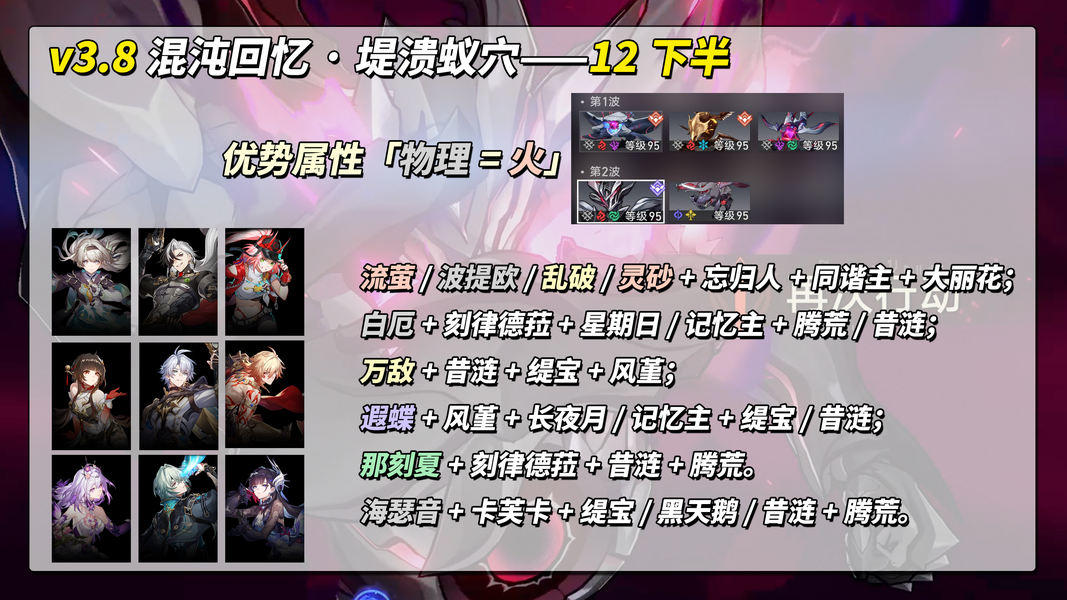 作为3.X时代的最后一期「3.8混沌回忆·堤溃蚁穴」,本期难度中规中矩。接下来冻梨会给出关卡敌方应对策略,并推荐一些不错的阵容、配队,大家可看看其中是否有你所持有角色,以最佳组合拿下本期奖励~