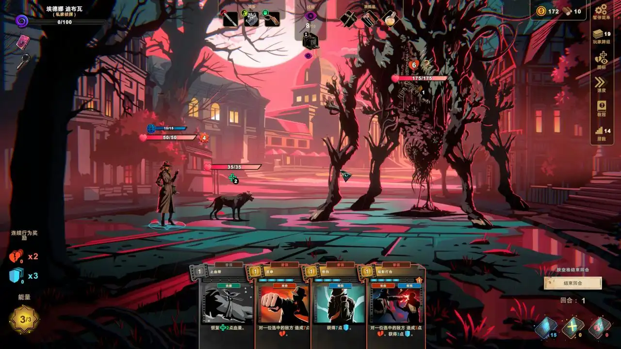 而每次关卡的路径选择也采用了卡组抽取的形式,通过选择不同的卡牌来触发战斗或是事件,人类敌人关卡、怪异生物敌人关卡、以及精英关卡、boss关卡等,而事件则包括获取材料、商店、回复血量、回复理智等等,也有着其他怪异的事件触发,而事件中不同的选项也将为我们带来意想不到的收益或损失