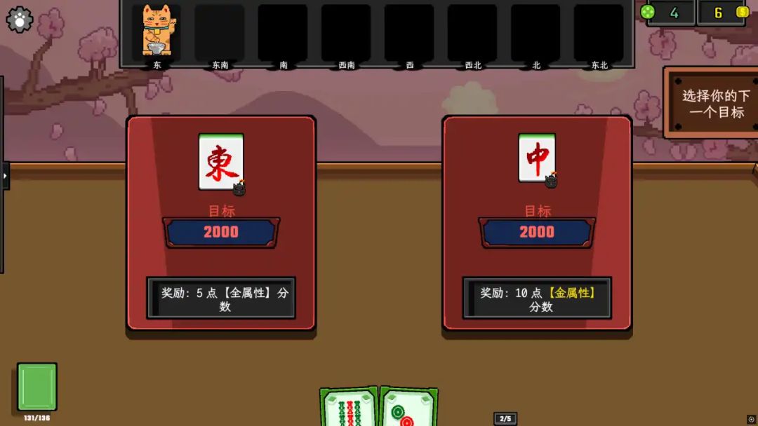组成这些组合的用处就是,我们会得到各种数量的“番”,我们牌桌上的所有牌都有基础点数,最后结算的时候,会把所有牌的点数加起来,然后乘以我们获得的“番”的数量,也就是翻几番嘛,因此我们在游戏中的两个目的,一个是获得尽量多的基础分数,一个就是获得“番”,二者相乘得到最终分数,则每局游戏的通关目标就是我们在有限回合内累计获得具体分数才行,而用到的回合数越少,我们完成游戏后获得的金币就越多。