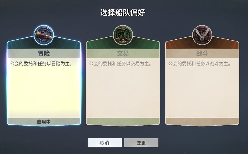 所有玩家可根据自身游戏风格,从 “冒险”“贸易”“战斗” 3 种类型中,选择适配的船队属性。