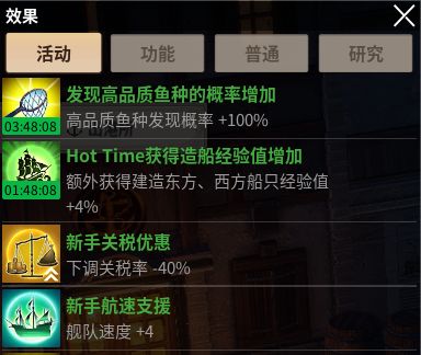 具体涵盖内容包括:各国任务奖励、航海过程中触发的增益 / 减益效果、各类灾害带来的持续影响、新手专属优惠及当前生效的庇护效果等信息。